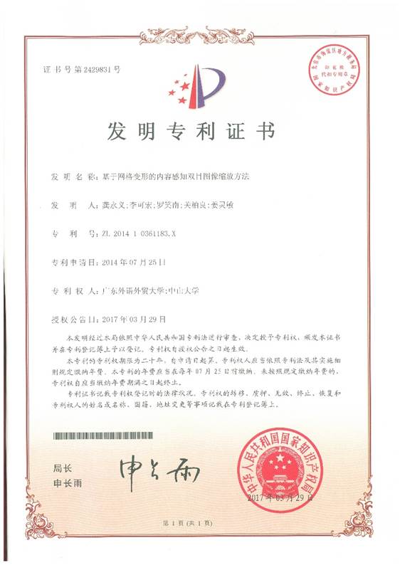 [8] 龚永义等.基于网格变形的内容感知双目图像缩放方法,国家发明专利,授权号:ZL201410361183X