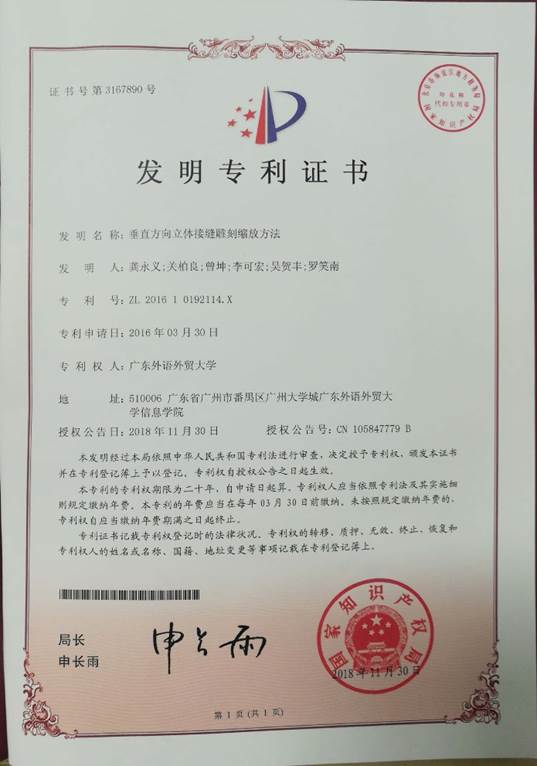 [9] 龚永义等.垂直方向立体接缝雕刻缩放方法,国家发明专利,授权号:ZL201610192114X