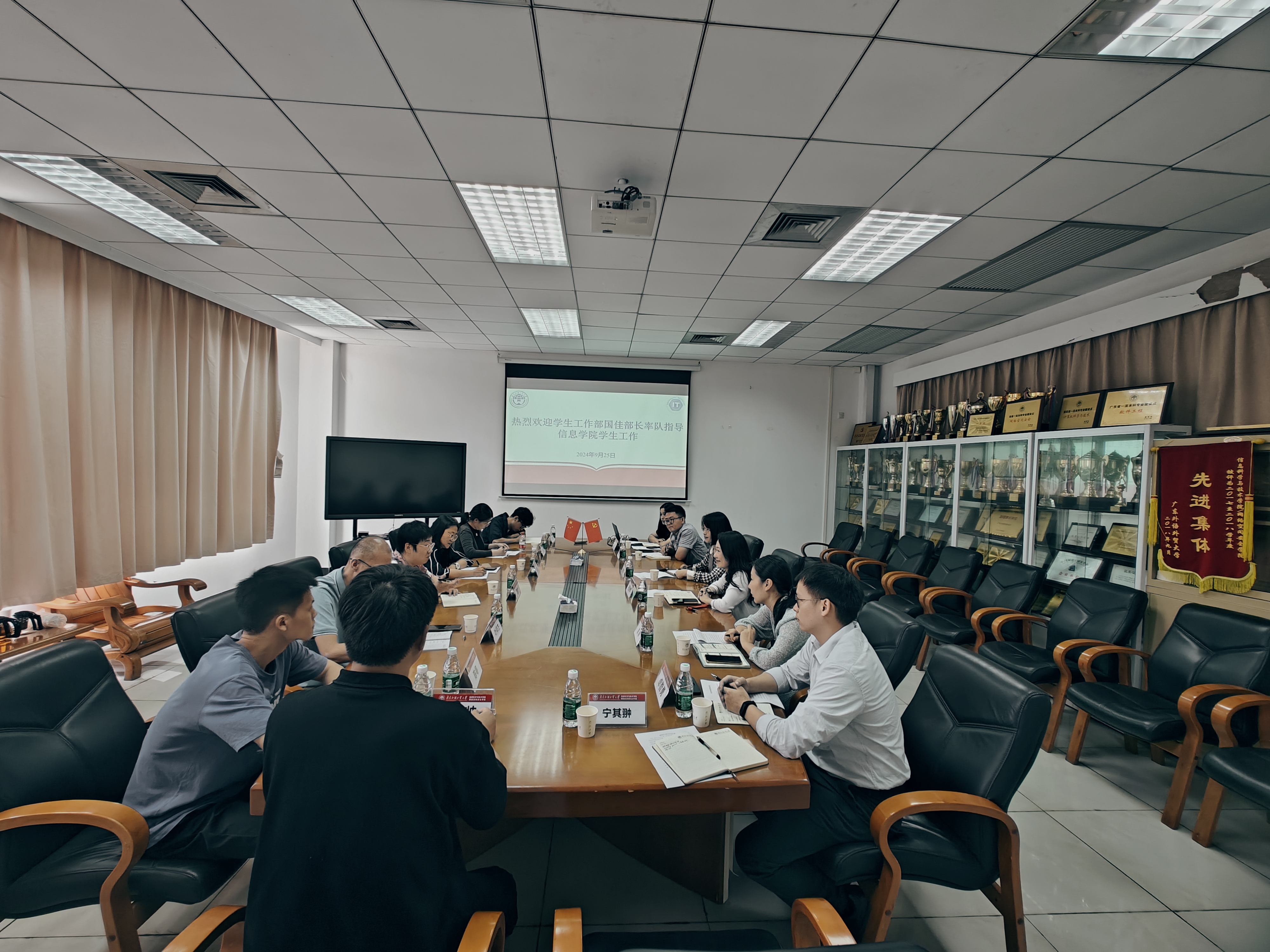 柯晓华书记对学生工作部莅临学院指导学生工作表示热烈欢迎,感谢学生工作部对学院工作的悉心指导和大力支持。刘丽玉副书记汇报了学院学生基本情况、学生工作队伍建设情况、近期学生工作要点及难点。会上,国佳肯定了信息学院学生工作团队的工作模式与成效,对今后信息学院学生工作发展给予了指导与建议,鼓励学院紧抓机遇,紧紧围绕立德树人根本任务,整合师生、校友资源,培养更优秀的工科人才。