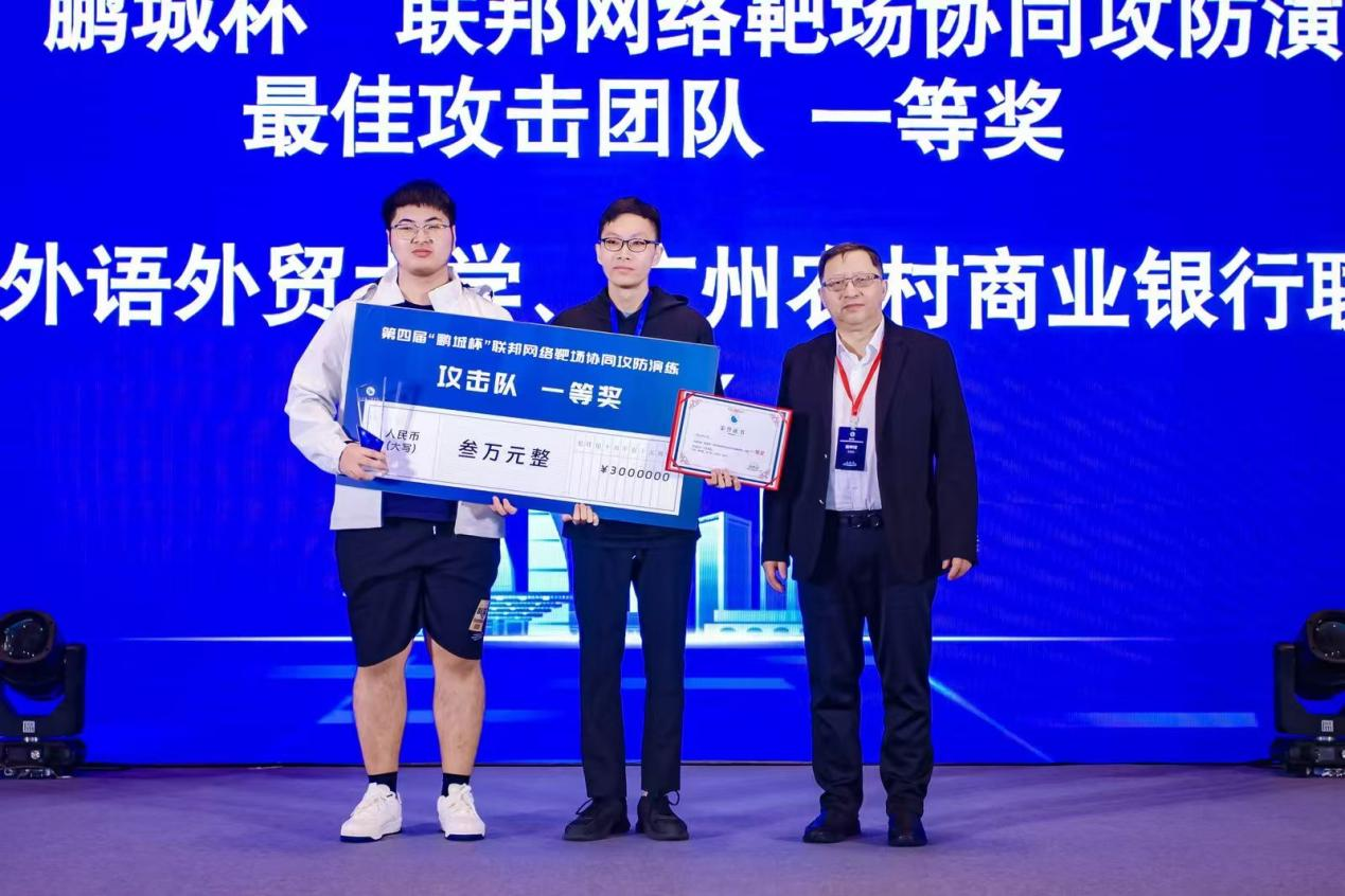 近日,由鹏城实验室主办的第四届“鹏城杯”联邦网络靶场协同攻防演练活动圆满结束。我院网络空间安全专业李子彦、邓轩翔、张裕凡等三名同学与广州农村商业银行的傅学瑜组成的战队“Base0x_0e”荣获冠军(奖金叁万元),其中来自广州农村商业银行的傅学瑜今年毕业于我院网络空间安全专业。此外,我院网络空间安全专业大二本科生周华丰同学作为主力的联合战队“S1uM4i”荣获季军(奖金贰万元)。