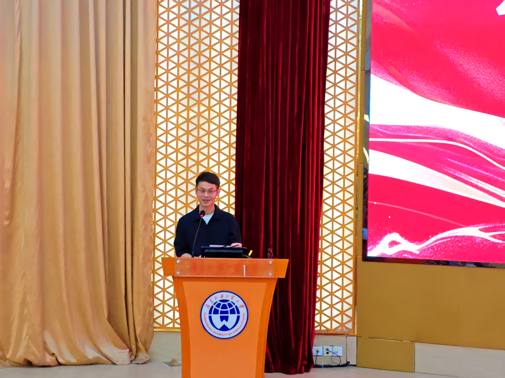 一段开场视频回顾了往届科技创新实践月的历程与成就。 随后,信息学院院长王常吉教授在致辞中提出,同学们要积极参加提升创新实践能力的“第二课堂”,深刻理解“科技月”所倡导的研究精神、创新意识与合作能力,薪火相传、勇攀高峰!接着,信息学院党委书记柯晓华教授现场宣读云阁奖学金获奖名单,云阁科技有限公司CEO邱钊海校友上台与柯书记共同为获奖学生及团队颁奖。邱钊海校友在接下来的分享中,结合自身经历鼓励广大师弟师妹在AI浪潮中做一名“冲浪者”,而非“观潮人”,勇敢地投身其中,去挑战、去创造、去失败、然后再站起来。
