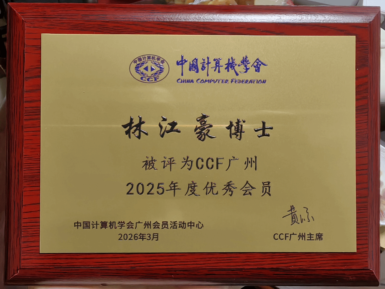 同时,林江豪博士获评“CCF广州2025年度优秀会员”。过去一年,他依托CCF广州分部及CCF广外学生分会平台,积极投身人工智能科普与社会服务,深入开展“进校园、走基层”等系列实践活动,推动人工智能知识走进课堂、走向社会,在提升公众数字素养、服务地方发展方面发挥了积极作用,为持续擦亮CCF广州公益品牌贡献力量。