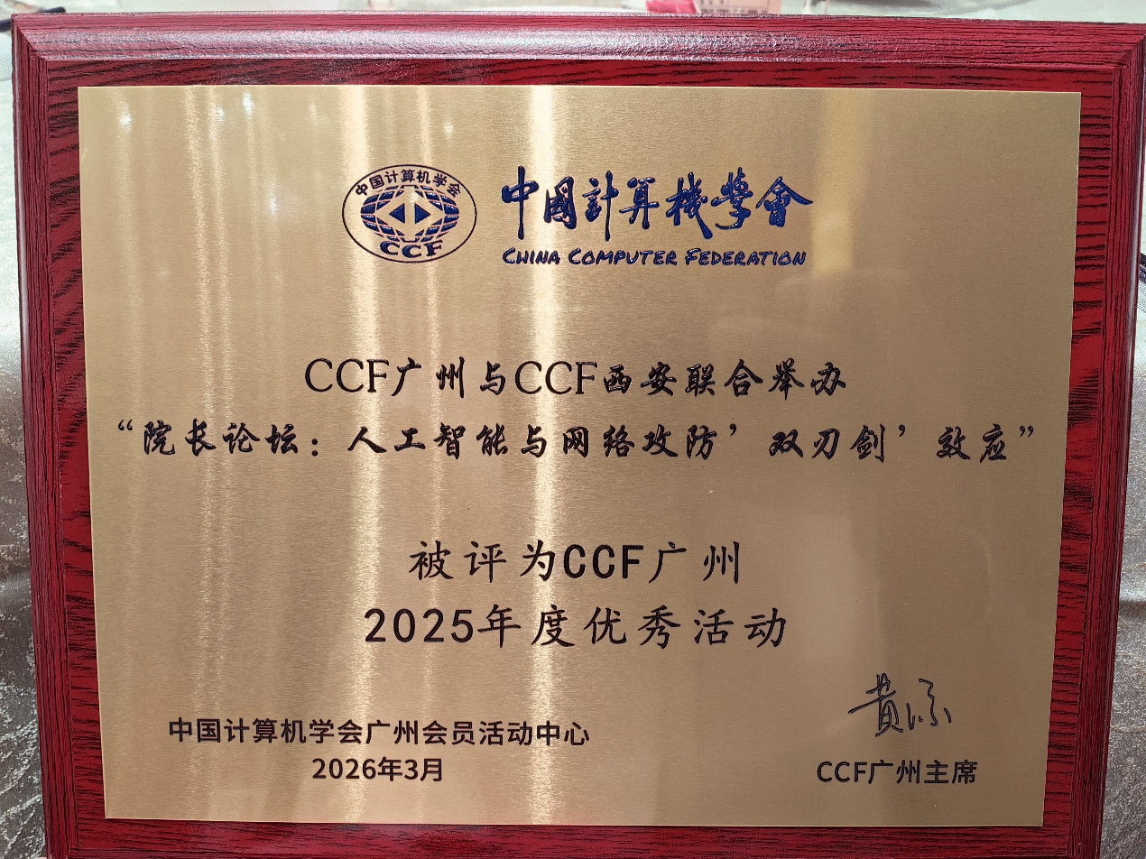 在本次表彰中,我院联合承办的“院长论坛:人工智能与网络攻防‘双刃剑’效应”荣获“CCF广州2025年度优秀活动”称号,学院党委书记柯晓华代表学院领奖。该论坛紧扣人工智能与网络安全融合发展的时代命题,汇聚西安与广州两地高校专家学者,围绕智能技术赋能网络攻防、风险防控与治理创新等前沿议题展开深入探讨。论坛首次实现两地高校在网络安全领域的高层次对话,回应了“以安全筑基现在、以智能赋能未来”的时代关切,为人工智能与网络攻防交叉领域的科研协同、人才培养和产业合作开辟了新路径,也为内地与粤港澳大湾区科技协同发展注入新动能。