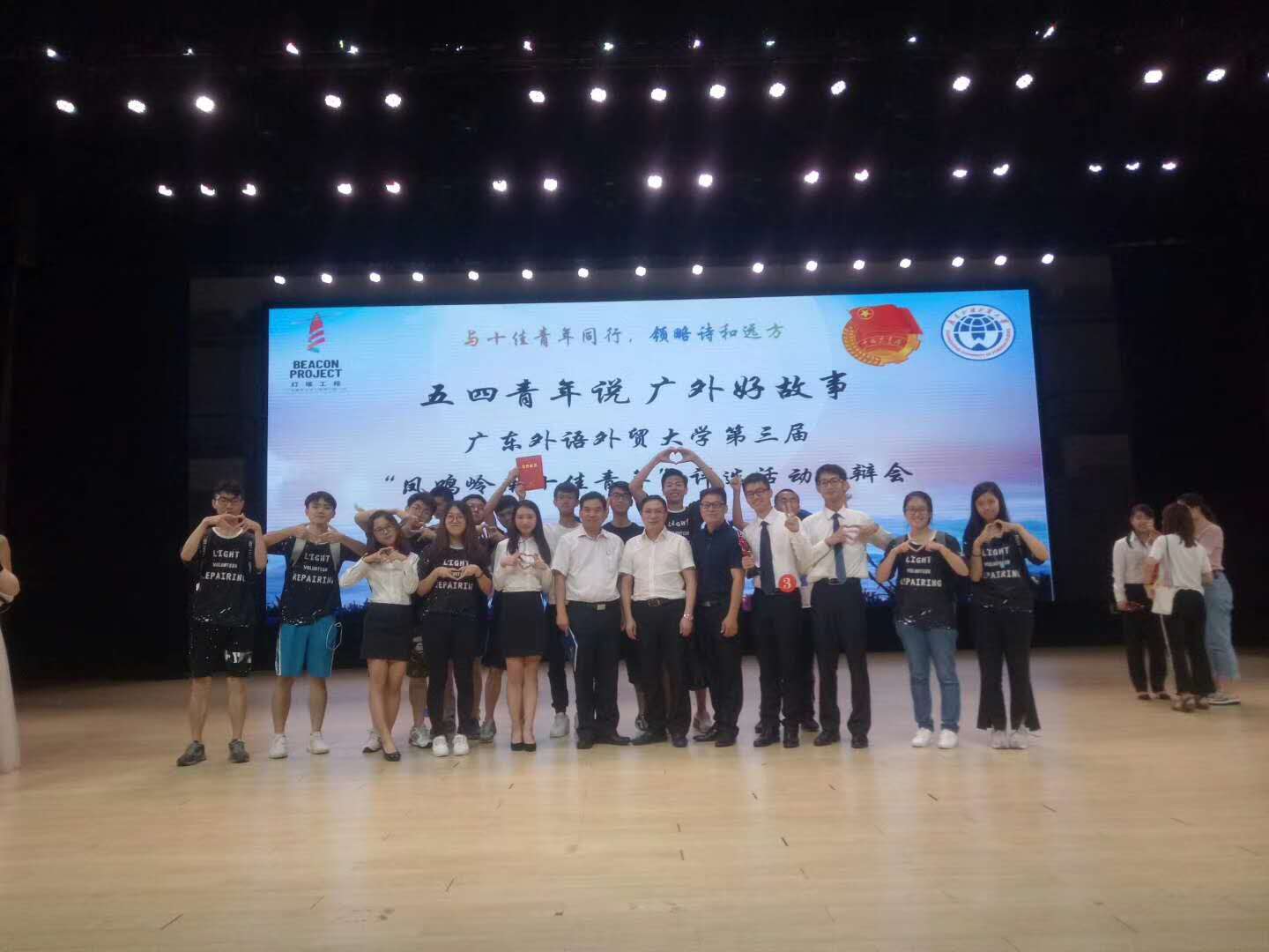 本网讯 5月2日晚,广东外语外贸大学第三届“凤鸣岭南十佳青年”评选活动答辩会于北校区云山会堂举行,我院Light志协义修队荣获“凤鸣岭南十佳青年”称号,并被誉为“公益践行者”。“凤鸣岭南十佳青年”活动旨在宣传、评选和表彰在学术学习、科技创新、文艺体育和公益志愿等方面表现突出的广外学子。从而进一步营造促进青年学生健康成长、成才发展的文化氛围,以十佳青年为示范榜样引导广外学子。