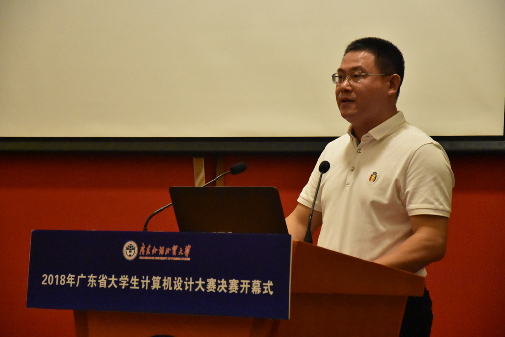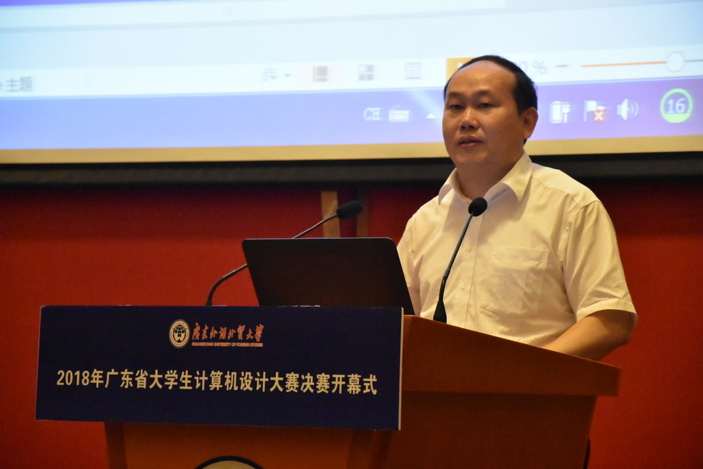 广外副校长阳爱民在致辞中指出当下以计算机为基础的创新意识,以及精通计算机技术的人才是社会发展急需,同时计算机应用能力亦是当前大学生适应时代的必备能力之一,大赛为省内大学生学习计算机技术、运用信息技术解决实际问题的能力、培养团队合作意识和创新创业能力,提供了展示与交流计算机教育经验与成果的平台。并表示很荣幸再次承办此次大赛,未来学院将坚持自身专业特色,期待将此大赛打造成我校承办的品牌活动,为高校计算机教育与人才培养贡献力量。