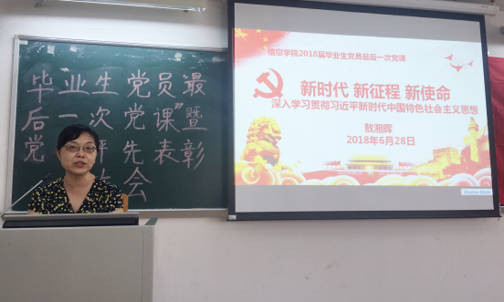 信息科学与技术学院党委书记敖湘晖以“新时代,新征程,新使命,深入学习贯彻习近平新时代中国特色社会主义思想”为主题,为毕业生党员上了最后一堂党课。她勉励毕业生党员在以后的工作岗位上认识到作为党员,要更加严格要求自己,服从党组织工作,合理安排时间。同时带领学生党员重温党的十九大和习近平新时代中国特色社会主义思想,分别就怎样理解中国特色社会主义“进入新时代”、新时代的新使命、新思想、新方略、和新征程以及加强党的建设,强化党员意识,勇于担当作为三方面进行重温。希望在座党员能牢记自己第一身份是党员,努力在人生舞台上充分发挥聪明才智,尽情展现人生价值,让党组织为拥有优秀党员而荣耀,让母校为培养出优秀人才而自豪,同时感谢各位党员对学员发展所作的贡献!