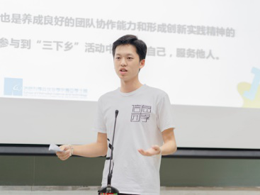 在经验分享中,王炜杰与同学们分享他的“三下乡”经历。他指出,这是一场心灵的旅行,在大学中真的要参加一次‘三下乡’,这是一次非常难忘的经历,在这里可以交到朋友,可以学习到技术,与小朋友们一起进步,给小朋友带去温暖,带去陪伴和关心。