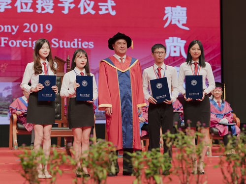 本网讯 2019年6月28日上午,广东外语外贸大学(以下简称广外)金融学院、英语教育学院和信息科学与技术学院2019届毕业典礼暨学位授予仪式在大会堂隆重举行。出席本次毕业典礼的领导和嘉宾有:广东外语外贸大学党委书记隋广军教授、副校长焦方太、王廷惠、刘建达教授,导师代表金融学院易行健教授、杨菁菁教授、贺显南教授、姚海洋教授,英语教育学院董金伟教授、吴岩教授、权立宏教授,信息科学与技术学院蒋盛益教授、李霞教授、龚永义教授、刘景发教授。副校长王廷惠教授主持本次仪式。
