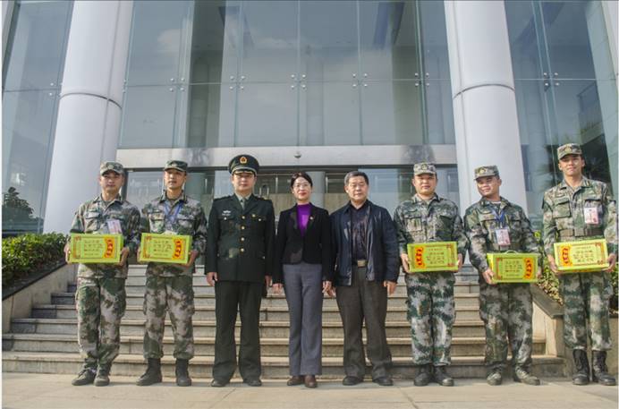 紧接着,蒋院长和朱书记先后向教官、军训学生和班导赠送了慰问品,感谢大家的辛勤付出。