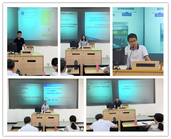 接下来,学院全体领导班子围绕各自负责的工作进行发言。朱珍葶的发言“以高质量党建推动学院发展”为题,重点介绍了学院党建工作的亮点与特色,围绕立德树人中心,凸显“特”,突出“新”,聚焦“实”,效果“佳”,同时,她也对目前党建存在的问题和下一步的工作思路进行了阐述。我院党委副书记肖锋对上半年学生工作进行了回顾,聚焦两大关键词“抗疫”、“就业”,然后他从疫情防控、学生心理健康、校园文化建设、学生就业指导等四个方面对下半年的工作进行了重点规划。我院副院长李霞围绕上半年科研项目申报和立项情况、上一年度研究生招生情况和下半年科研和研究生工作重点等三个方面作了发言,尤其值得一提的是,我院研究生规模在2020年实现了新突破。我院副院长王常吉就分管的学生实习实践基地、学院实验室和国际交流等模块的工作进行了汇报,特别指出了新形势下国际交流对学科评估、专业建设和项目申报的重要性。我院广州市非通用语种智能处理重点实验室副主任王连喜向我院教师介绍了2019年成立的实验室,对其基本定位、建设基础和未来发展做了详细的介绍,也欢迎更多老师加入实验室的各项工作当中。最后,我院院长蒋盛益以“迎接挑战,提高人才培养质量”为题发言,他指出,2020年,是全面建成小康社会和“十三五”规划收官之年,也是谋划“十四五”规划的关键之年,他分享了学院“十三五”规划的完成情况,也公布了“十四五”规划的总体目标和核心指标,同时,他就本学期人才培养工作进行了重点部署。