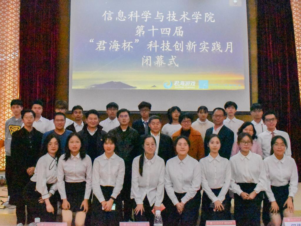 本网讯 2020年12月9日晚,广东外语外贸大学信息科学与技术学院“君海杯”第十四届科技创新实践月闭幕式暨颁奖典礼在八角楼顺利举行。校党委常委、副校长何传添教授莅临现场并为大会致辞。学生处副处长国佳,校团委副书记刘茹楠,就业指导中心副主任苗磊,校友代表、广州君海网络科技有限公司联合创始人邓志伦及信息学院领导班子、师生代表出席活动。