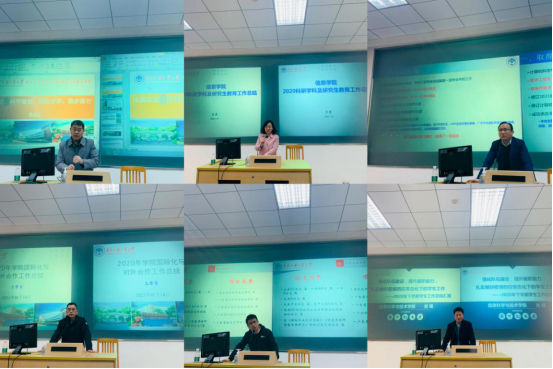 李霞副院长对2020年科研学科及研究生教育工作进行总结发言,汇报年度学院科研项目申报及立项情况,和年度学院研究生招生及教育培养情况,尤其针对第5轮学科评估工作,分享对学院未来工作要点的思考,尤其从研究生授课质量提升及课程思政建设、围绕学科点评估的研究方向凝练和团队建设、方向稳定和持续的高显示度成果累积、推动2~4个代表性的社会服务工作等方面,表示应把工作做在前面,应对下一轮学科评估工作。