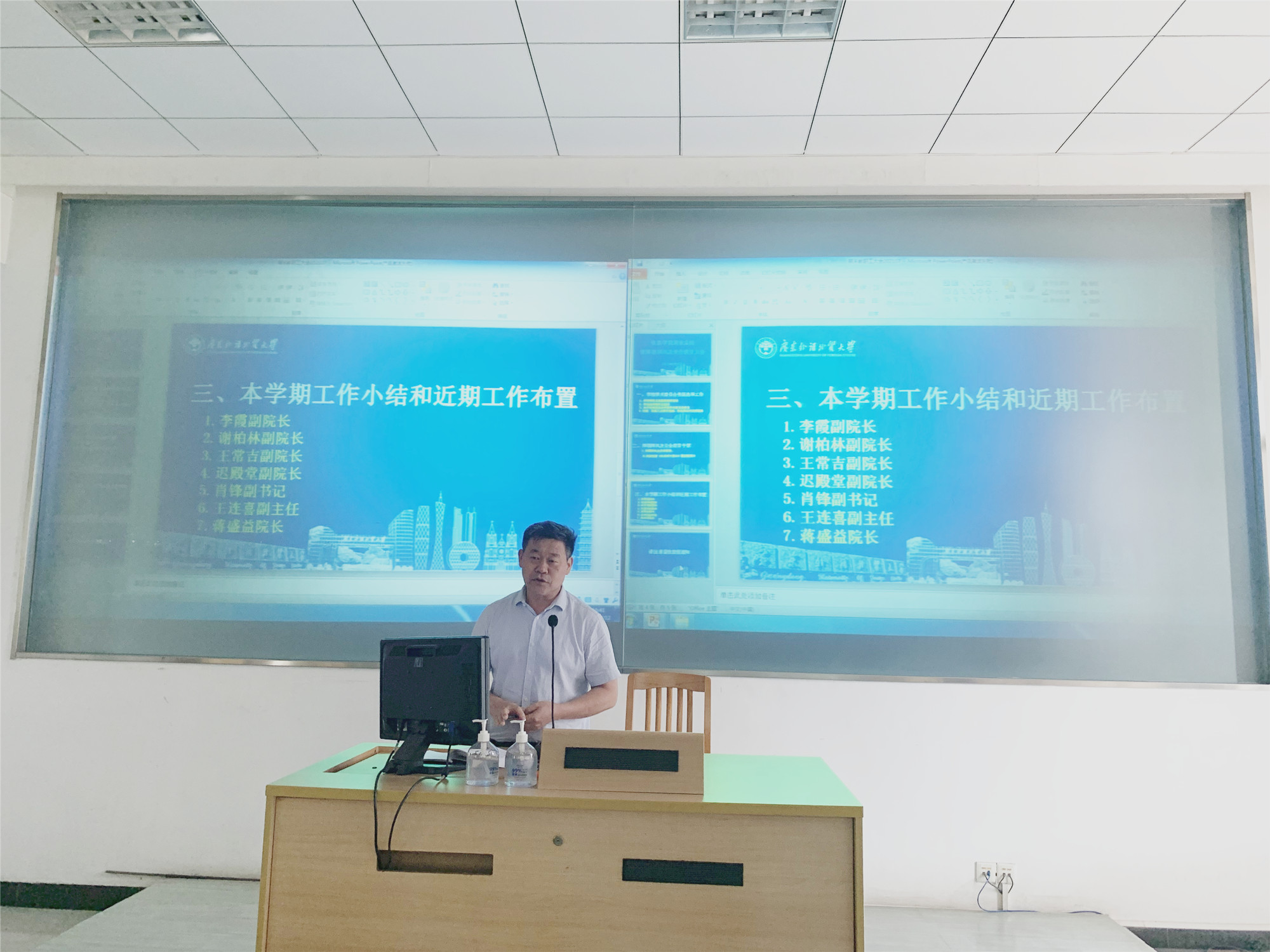 接着,学院全体领导逐一对各自分管的工作进行了总结汇报,并报告了下半年的工作计划。副院长李霞对本学期科研项目申报及立项、研究生招生和师资队伍建设、研究生培养方案修改的具体情况进行了总结,也对如何取得更好的成绩提出了建议。副院长谢柏林对一流专业和课程申报工作、教学评奖、人才培养等方向的工作进行了汇报,从“广外女生”培养到第七代的历程提出育人“长期主义”的必要性,也以张桂梅“用生命育人”的故事勉励学院教师无私奉献、为国育才。副院长王常吉汇报了疫情期间外教和国际交流工作的进展,也总结了上半年学生竞赛和实验室工作的进展,特别是在“我为群众办实事”方面的突出表现。党委副书记肖锋从学生疫情防控、党史学习教育、品牌活动建设、毕业生就业和学生暑期活动等五大方面介绍了我院学工的整体情况。非通实验室(广州市非通用语种智能处理重点实验室)副主任王连喜汇报了实验室前期的学术成果和今后的目标。