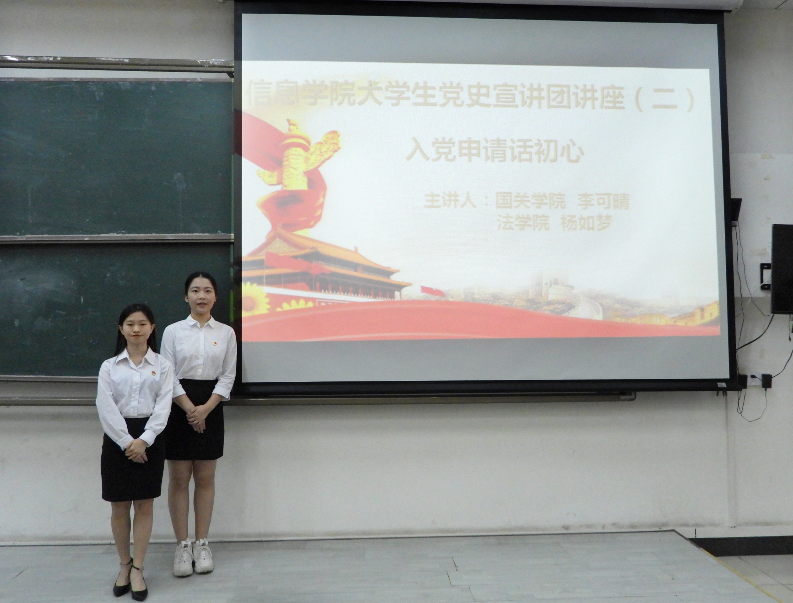 2021年9月27日下午,为推动党史学习教育走深走实,发挥大学生宣讲团朋辈引领作用,引导青年学生做到学史明理、学史增信、学史崇德、学史力行,坚定理想信念,淬炼党性修养,信息学院邀请“凝聚青春力量,赓续精神血脉”百年党史大学生宣讲团第九小组成员为2021级新生开展学习贯彻习近平总书记建党百年“七一”重要讲话精神系列讲座之“入党申请话初心”主题讲座。本次活动邀请到了国关学院本科生李可晴和法学院本科生杨如梦作为主讲人,信息学院学生党建指导老师龙晓岚主持了该场讲座。