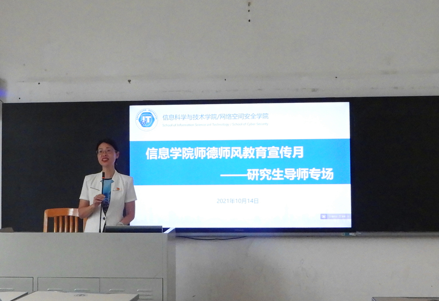 本网讯 2021年10月14日下午,信息科学与技术学院在教学楼F202召开师德师风教育宣传月—研究生导师专场会。学院党委书记朱珍葶、院长蒋盛益、全体研究生导师参加会议。会议由副院长李霞主持。