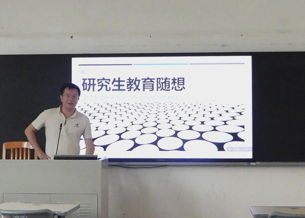 优秀研究生导师杜剑峰教授也为大家做主题分享,他从学院研究生培养的特点切入,提出应将精英教育和个性化教育两种模式相结合。他提出,一个好的导师要从学生的具体情况出发,根据不同学生的资质设定合理的门槛和阶梯目标。杜剑峰教授结合教育领域和人工智能领域分享他在教育问题上的思考。他提到“授人以鱼不如授人以渔”,教育的目标不是知识本身,而是教会学生知识的元知识。在师生相处模式上,他指出导师对学生的科研、学术要严厉;对学生的生活、实习要宽容,给学生足够的自由空间。