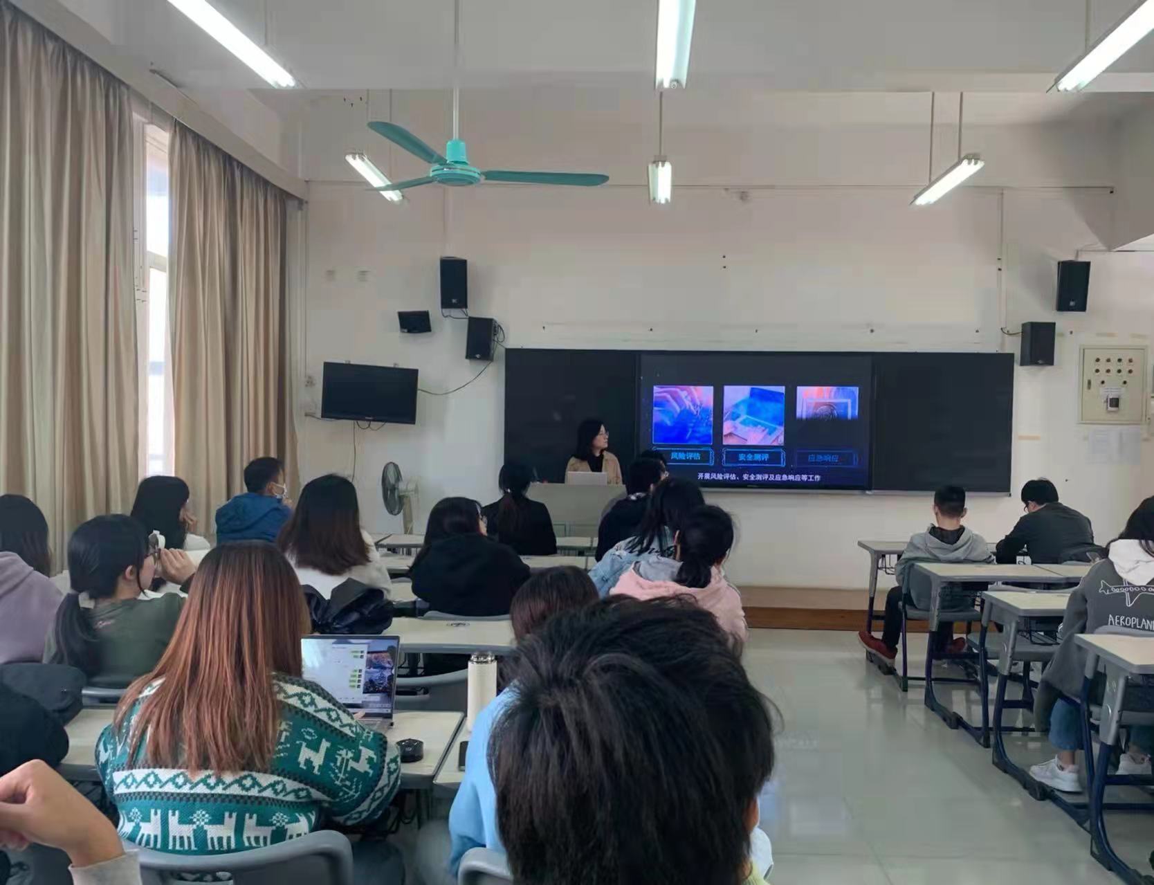 广东省安全测评中心的负责人进行了企业宣讲,介绍了单位的基本信息、招聘岗位、专业需求及福利待遇等,使同学们更深入地了解广东省安全测评中心。