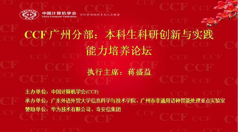 2021年11月28日,由中国计算机学会(CCF)主办,广东外语外贸大学信息科学与技术学院承办的“本科生科研创新与实践能力培养论坛”在广州大学城中心酒店三楼南湖厅顺利召开。本次论坛由CCF广州执委、广东外语外贸大学信息科学与技术学院院长蒋盛益教授担任执行主席。论坛邀请了华南理工大学计算机学院副院长高英教授、广东技术师范大学网络空间安全学院院长蔡君教授、广东工业大学计算机学院副院长谢光强教授、广东外语外贸大学信息科学与技术学院院长蒋盛益教授、华为技术有限公司计算产品线鲲鹏高校生态发展总监严伟、奇安信集团广东省分区行业总监李双喜作分享报告。会议吸引了华南师范大学、广东财经经大学在内的十多所高校和企业人员20余人线下参与。华为技术有限公司和奇安信集团提供赞助支持。