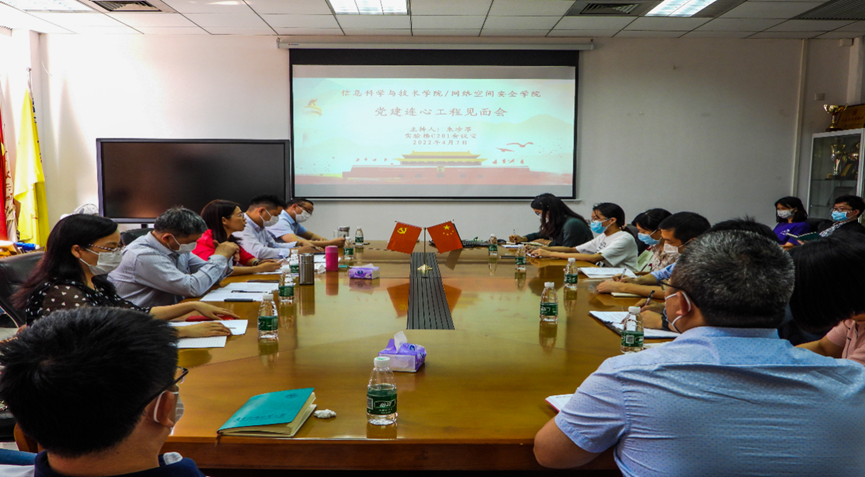 2022年4月7日,广东外语外贸大学信息科学与技术学院、网络空间安全学院“党建连心工程”见面会在学院会议室召开。学院党委委员、全体班子成员、党支部书记和联系教师、学生代表等参加会议。会议由朱珍葶书记主持。