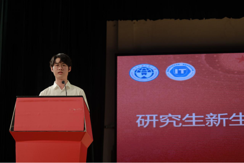 2022级网络空间安全专业何俊毅同学代表研究生新生发言。在发言中,何俊毅分享了自己大学四年在广外的学习生活,倡议全体新生谨记习近平总书记教导,为祖国的发展贡献出自己的力量。