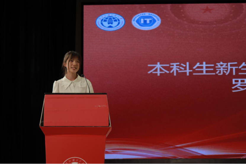计算机2204班罗文妤同学代表本科生新生发言。罗文妤分享自己收到录取通知书时的喜悦,同时希望广大新生保持高昂的学习热情,积极融入大学生活,多与他人交谈,不断提升自我。