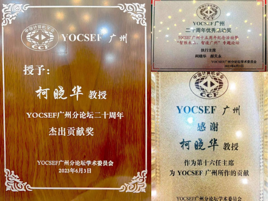本网讯 中国计算机学会CCF YOCSEF广州于2023 年6月3日在暨南大学举办YOCSEF广州二十周年庆典活动。我院党委书记柯晓华教授喜获“杰出贡献奖”,我院2018年承办的YOCSEF广州十五周年庆典活动获得“优秀活动奖”。