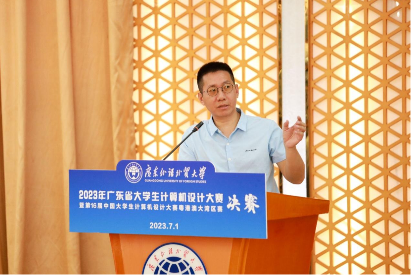 本网讯 2023年7月1日,由广东省教育厅主办的2023年广东省大学生计算机设计大赛暨第16届中国大学生计算机设计大赛粤港澳大湾区赛决赛在广东外语外贸大学大学城校区成功举办。广东省教育厅高等教育处副处长吴华明,广东外语外贸大学校党委常委、副校长焦方太,教务部副部长唐静,现代教育技术中心副主任廖信海,75位专家评委、部分带队教师出席了决赛开幕式。开幕式由信息科学与技术学院/网络空间安全学院院长王常吉教授主持。