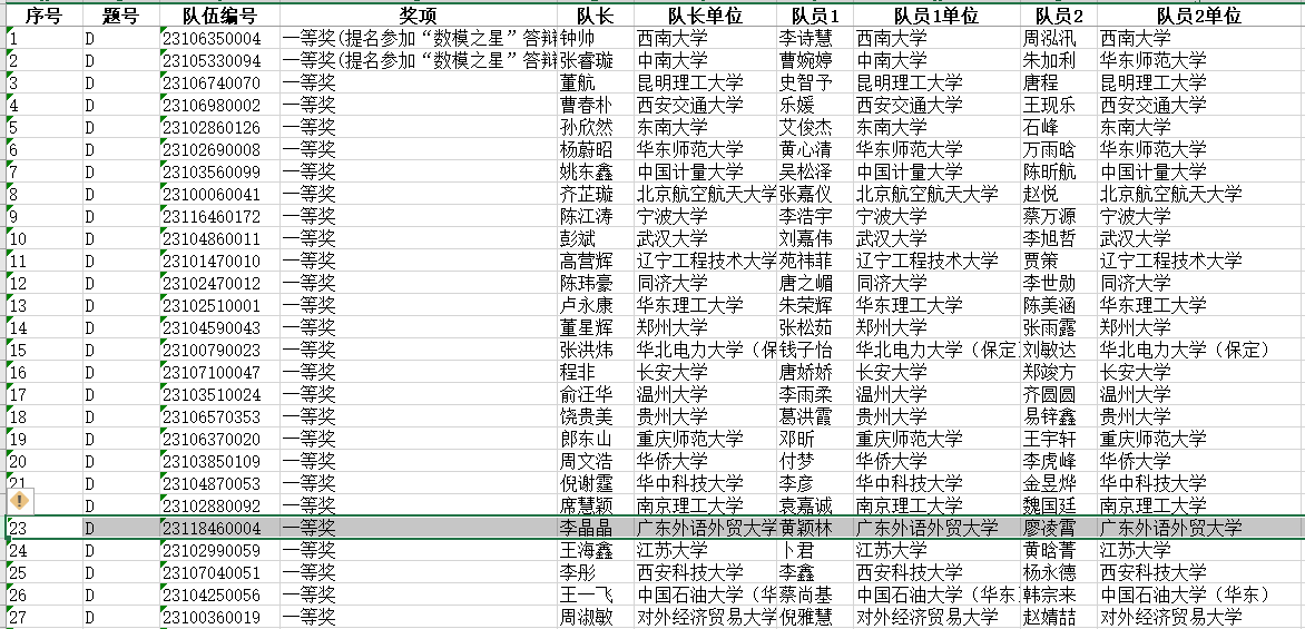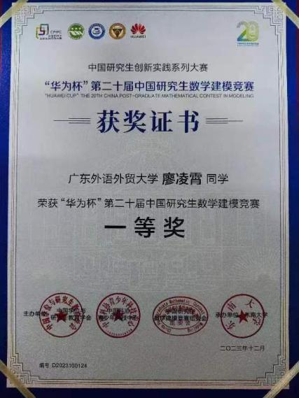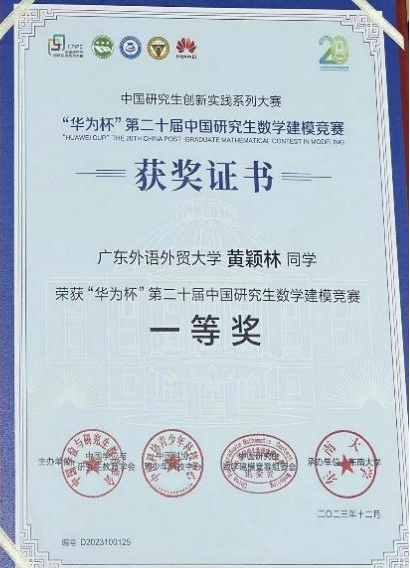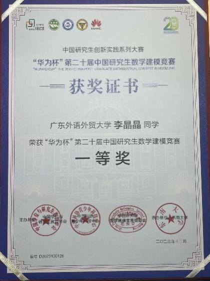 本网讯 12月15-17日,由东南大学举办的“华为杯”第二十届中国研究生数学建模竞赛圆满收官,来自广外信息科学与技术学院/网络空间安全学院的三名研究生李晶晶、黄颖林、廖凌霄同学组成的团队荣获全国数学建模竞赛一等奖。