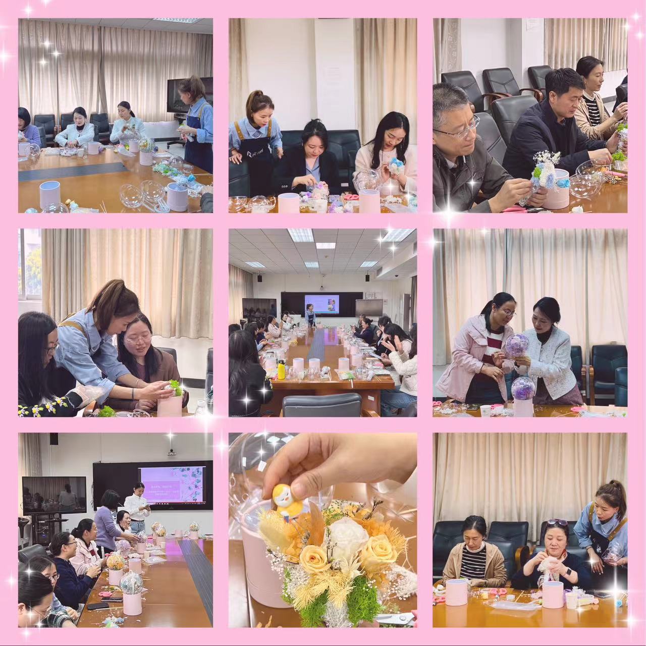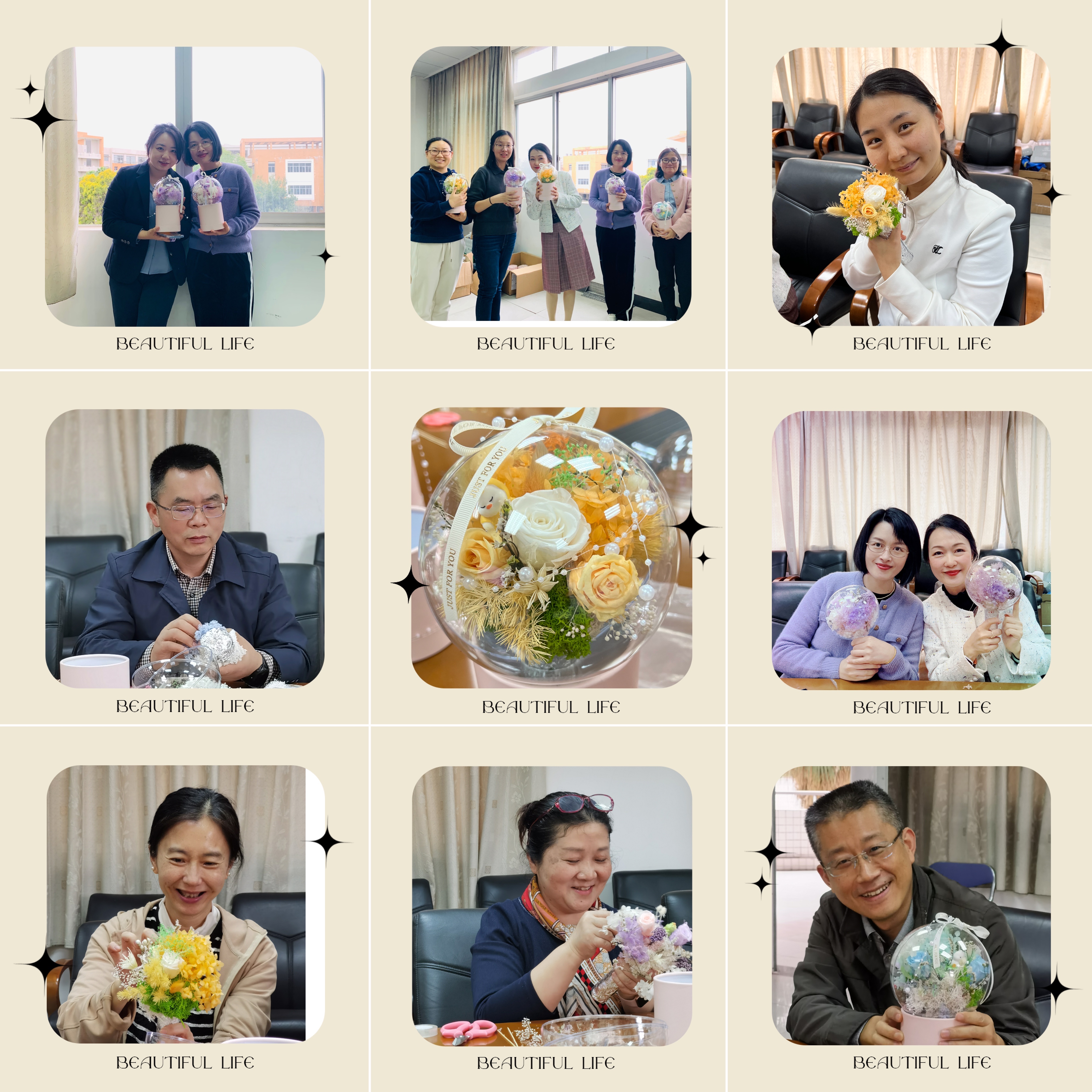 此次活动,学院工会提前邀请了专业花艺培训师,选择了永生花进行制作,提前精心准备好所需材料,布置好活动现场。制作过程中,老师们热情高涨,大展艺术天赋,布局、插花、定型、包装,大家忙得不亦乐乎,纷纷互相分享各自独特作品。永生花可存放2-3年,每一捧花都成为每位教工的节日礼物,寄托着学院工会的关怀,给予教工们独特的纪念。