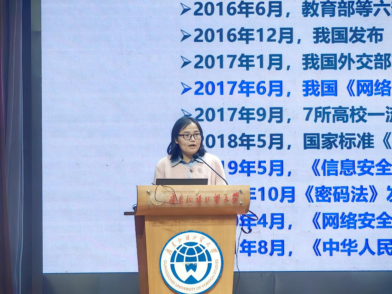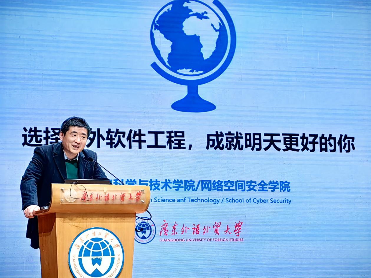 网络空间安全系主任刘珍从现实生活中网络攻击的例子引出:目前国家十分重视网络空间安全专业人才的培养,就业前景较好。介绍了结合学校特色的“广外女生”战队,欢迎同学们加入网络空间安全专业,一起探索广袤空间,共创美好未来。