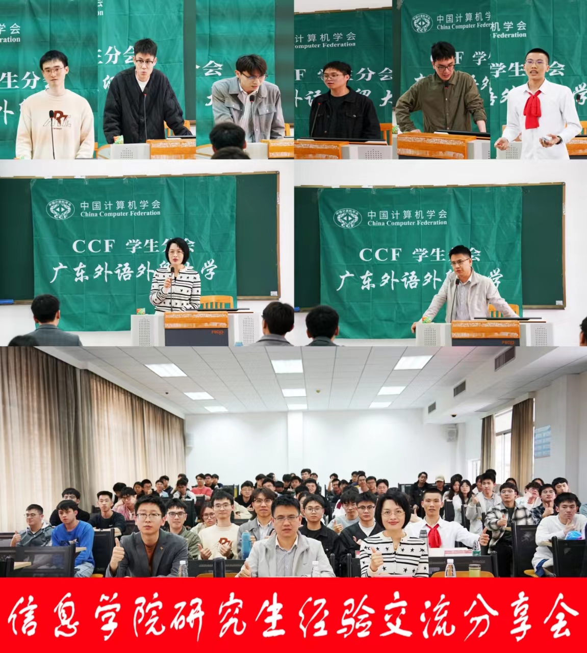 六位优秀研究生进行了经验分享。已签约阿里巴巴集团的陈源同学介绍了他如何高效规划研究生生活和职场求职的经验。成功签约广汽埃安的彭子陶同学,以及即将入职中国移动的郑仰佳同学也详细介绍自己做科研和找工作经历,并鼓励在座的师弟师妹们勇于尝试、积极探索。申博成功的冯兴宇同学详细介绍了自己的申博经历,并鼓励师弟师妹们要扎实科研、脚踏实地。研二的王俊朗同学和研一的徐颂喜同学分别分享了他们在的科研实践与导师沟通的重要性,并谈到了对未来学术道路的展望和学习与休息的平衡。
