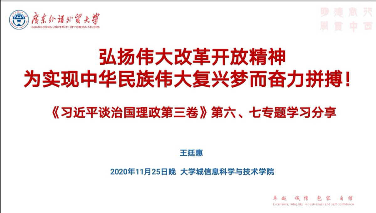 王廷惠教授以《弘扬伟大改革开放精神,为实现中华民族伟大复兴梦而努力拼搏》为主题,分享了《习近平谈治国理政》第三卷第六专题“推动全面深化改革实现新突破”和第七专题“行成全面开放新格局”的学习心得。她带领我们回顾了中国的改革开放之路,点明全面深化改革是我们党守初心、担使命的重要体现;强调了广东在全国开放大局中的定位,带领大家再次温习了习近平总书记出席深圳经济特区建立40周年庆祝大会和视察广东重要指示精神,启示我们在全面深化改革中要勇立潮头,不断创新,学懂弄通做实,勇闯善创实干。