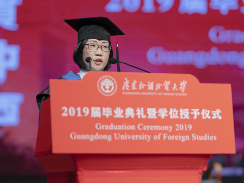 本网讯 2019年6月28日上午,广东外语外贸大学(以下简称广外)金融学院、英语教育学院和信息科学与技术学院2019届毕业典礼暨学位授予仪式在大会堂隆重举行。出席本次毕业典礼的领导和嘉宾有:广东外语外贸大学党委书记隋广军教授、副校长焦方太、王廷惠、刘建达教授,导师代表金融学院易行健教授、杨菁菁教授、贺显南教授、姚海洋教授,英语教育学院董金伟教授、吴岩教授、权立宏教授,信息科学与技术学院蒋盛益教授、李霞教授、龚永义教授、刘景发教授。副校长王廷惠教授主持本次仪式。