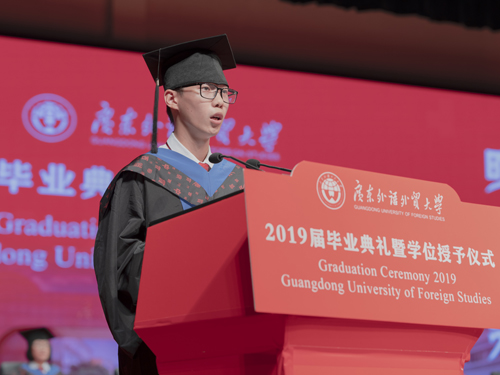 紧接着是信息科学与技术学院毕业生代表林楠铠发言,他先是代表全体毕业生对辛勤付出的指导老师和辅导员老师,始终给予关注和爱护的父母和一直朝夕相伴的同学表达由衷的感谢。之后,他回忆起自己四年来的所经、所历、所获,广外这一大舞台让他在这四年内收获颇丰。最后,他祝愿毕业生们能够长风破浪、扬帆起航,走向崭新的舞台。
