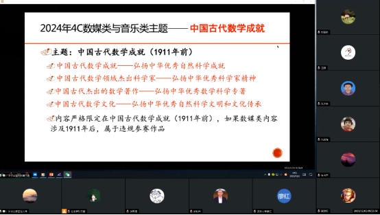 启动会的第二项议程,由北京林业大学淮永建教授为参赛师生解读国赛媒体类主题。 2024年4C数媒类和音乐类主题为:中国古代数学成就——中华优秀传统文化系列之四,淮教授围绕着中国古代数学成就——弘扬中华优秀自然科学成就、中国古代数学领域杰出科学家——弘扬中华优秀科学家精神、中国古代杰出的数学著作——弘扬中华优秀数学科学专著及中国古代数学文化——弘扬中华优秀自然科学文明和文化传承等四个创作角度,为参会师生们做了详尽的主题解读。