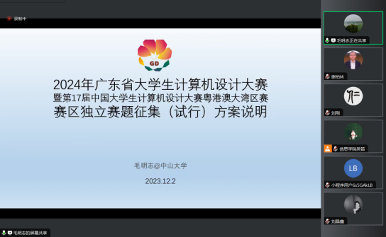 本网讯 2023年12月2日上午,由广东省教育厅主办、广东外语外贸大学承办的广东省大学生计算机设计大赛2023总结会暨2024启动会在线上成功举办。广东省教育厅高教处科长张兵,大赛组委会副主任王常吉教授、组委会副秘书长李宇耀博士,各参赛队伍指导教师代表及参赛学生代表等近160人出席此次会议,会议由大赛组委会秘书长谢柏林副教授主持。
