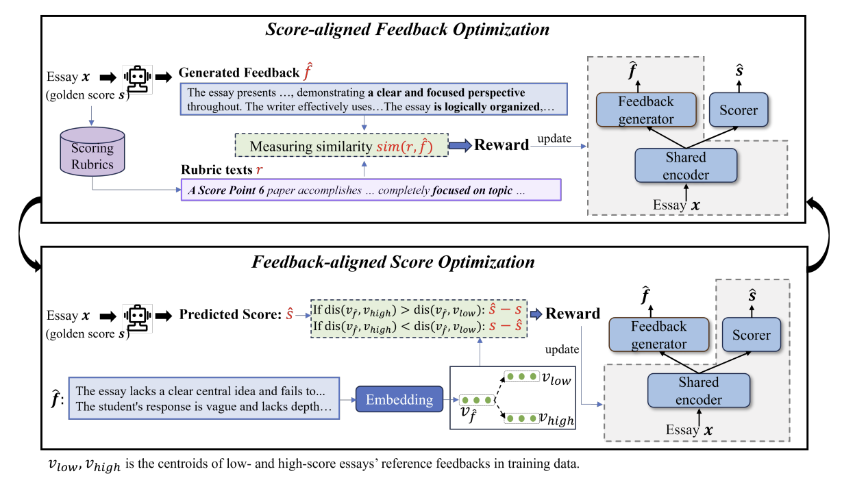 论文概述:当前大多数自动作文质量评估系统将分数预测与反馈生成视为两个独立的任务,忽略了一个关键事实:分数提供的是对写作质量的定量评估,而反馈则体现的是定性评估。这两种形式从不同的角度反映了作文的质量,本质上是一致的,并且可以相互强化。在本文中,我们提出了一种新颖的双向强化学习框架,有效利用这种一致性约束,实现分数预测与反馈生成的联合优化,从而确保二者之间的相互强化与对齐。通过这种方式使得我们的模型获得准确的评分结果与一致的文本反馈。我们在多个公开数据集上进行了广泛的实验,结果表明,该方法在评分准确性和反馈质量方面均优于现有的最新模型。