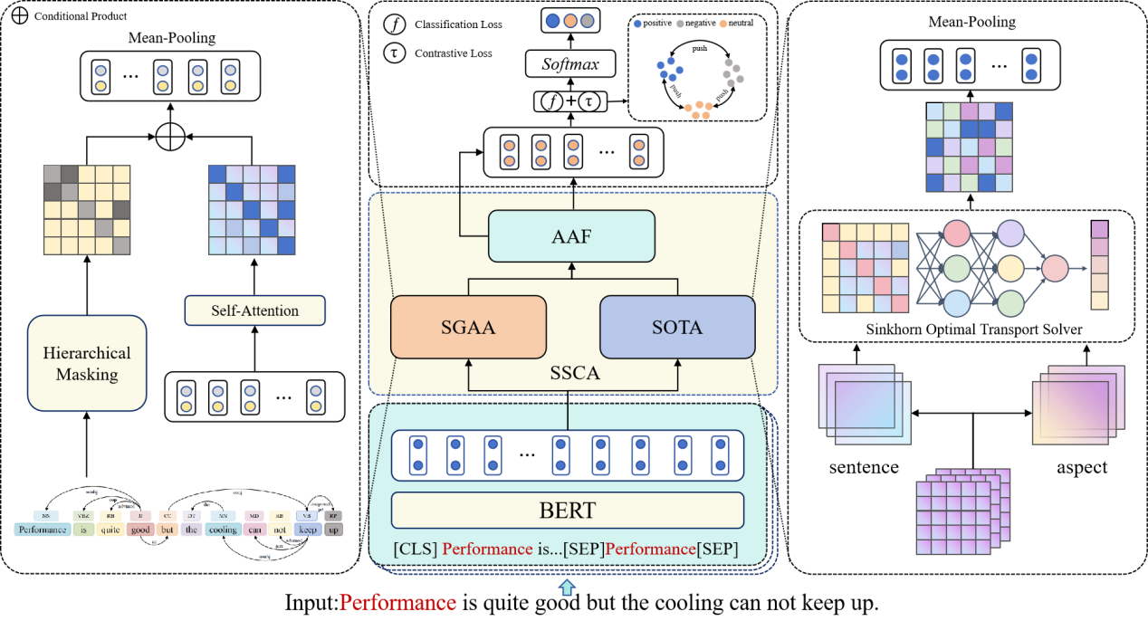 论文概述:方面级情感分析(ABSA)旨在识别评论文本中的方面词并判断其情感极性。现有研究虽尝试融合依赖树与上下文语义以获取结构信息,但大多依赖点积相似度与静态图结构,难以有效捕捉方面与观点词间的非线性关联,且在数据稀疏与噪声干扰下表现受限。为此,论文提出了一种基于最优传输增强的句法-语义图网络模型(OTESGN),以联合建模句法结构与语义分布。具体而言,该模型包含两个核心模块:句法图感知注意力(SGAA)模块利用句法引导的掩码机制建模全局依赖;语义最优传输注意力(SOTA)模块则将方面-观点对的关联建模为分布匹配问题,并通过Sinkhorn算法求解,以实现精准语义对齐。此外,模型通过自适应注意力融合(AAF)机制协同整合异构特征,并结合对比正则化以增强模型泛化能力。在多个公开数据集上的实验结果表明,OTESGN方法在捕捉细粒度情感关联和抑制上下文噪声方面具有显著优势。