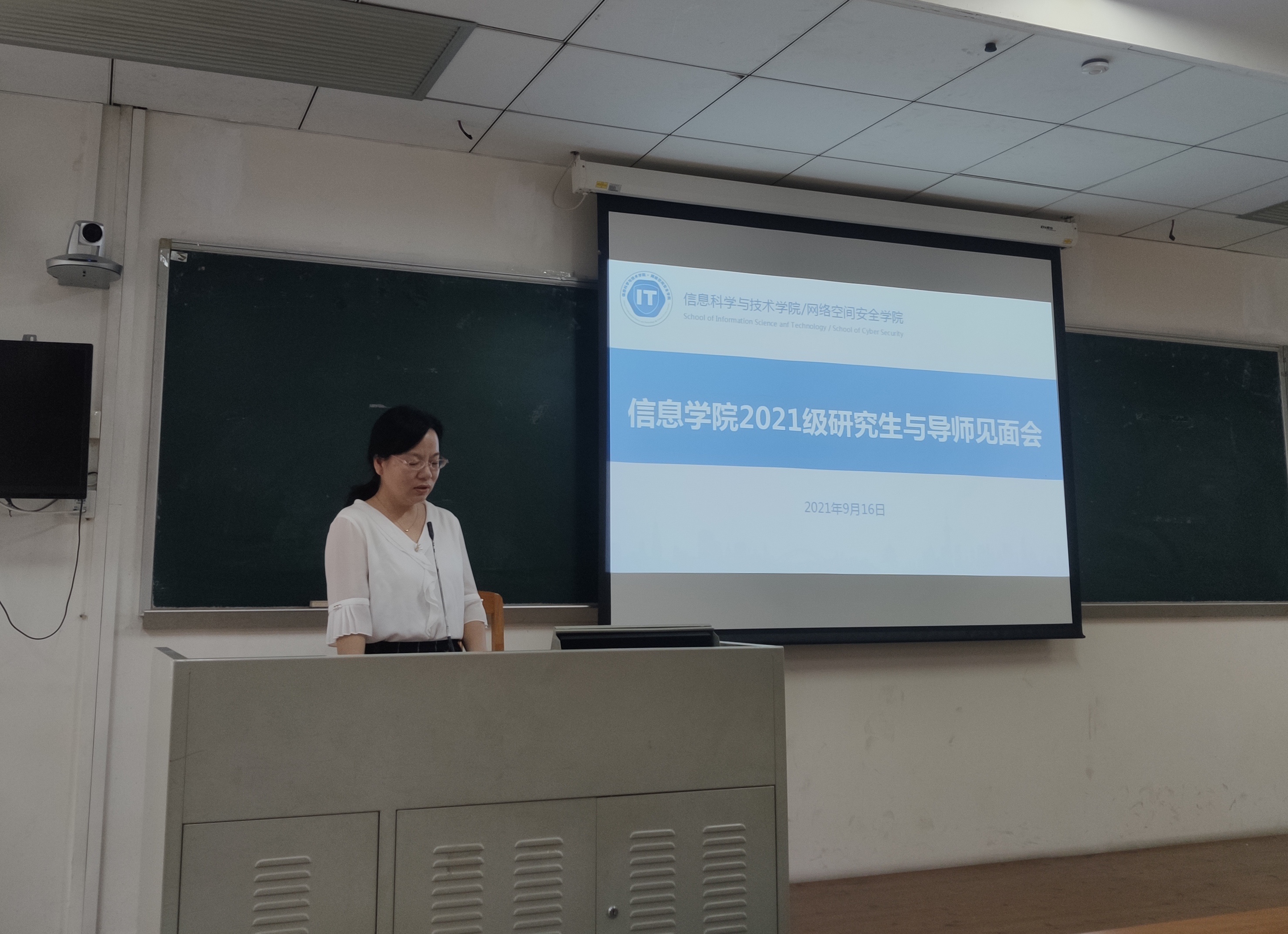 本网讯 9月16日下午,信息学院2021级研究生新生与导师欢聚一堂,开展师生交流见面会,会议由副院长李霞主持。李霞对2021级研究生新生加入信息学院表示祝贺和欢迎,她给在座的同学介绍了学院的研究生培养、研究生导师队伍、学科方向设置等情况,希望同学们尽快融入学院大家庭。