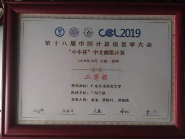 “第十八届中国计算语言学大会”(The Eighteenth China National Conference on Computational Linguistics, CCL 2019)技术评测日前落下帷幕。我校信息科学与技术学院2019级研究生黄锡轩,2017级本科学生谢逸和洪银纯在蒋盛益教授的指导下,经过激烈的角逐,在众多参赛队伍中,克服计算资源受限的困难,打败了众多企业和高校对手,代表我校取得高校队伍排名第一,总排名第三的好成绩,荣获二等奖。