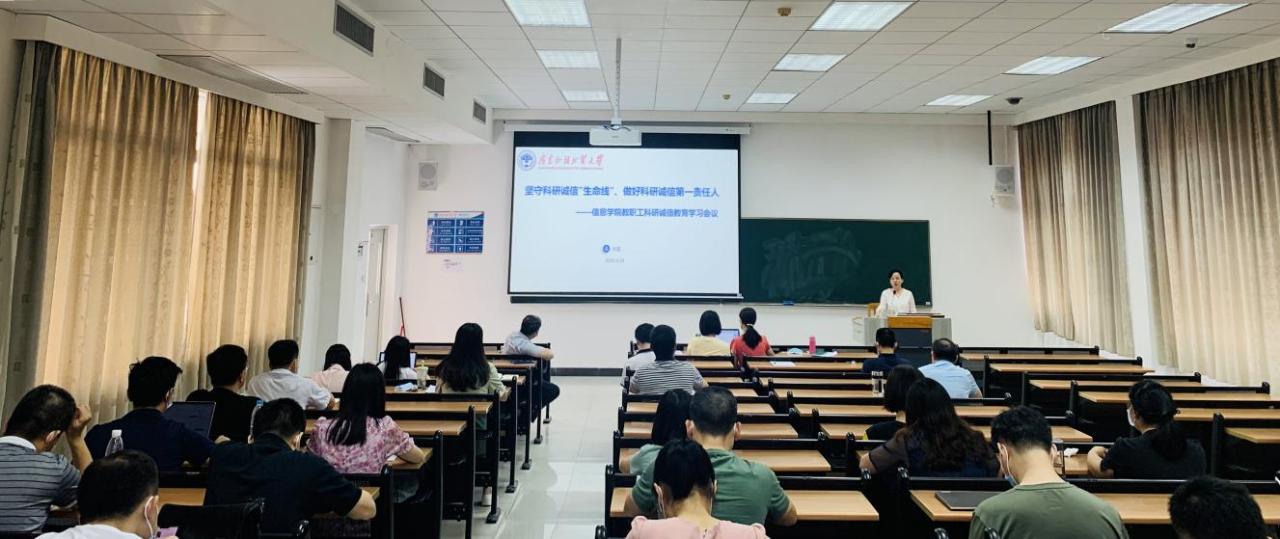 本网讯 为进一步增强我院教师科研诚信意识,推进科研诚信建设,弘扬实事求是,脚踏实地的科研精神,4月28日,信息学院于实验楼B107召开信息学院教职工科研诚信教育学习会议,副院长李霞做主题为“坚守科研诚信"生命线"、做好科研诚信第一责任人”的教育报告,学院全体教职工参加会议,院长蒋盛益主持会议。