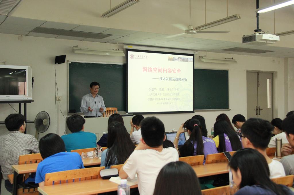 在讲座中,李建华主要介绍了当前网络空间内容安全的内涵及外延,国内外学术界和行业主要研究进展。他从四个方面展开,深入讲解现如今网络空间内容安全的重要性,分析了“互联网+”如何与网络空间安全密切相关、与各行各业深度融合,详细解释了网络空间的安全威胁演化、应用技术演进及多层次安全对抗,并阐述了信息技术发展带来的问题与挑战。对于作为当下潮流的新媒体,李建华也为参与者分析了其特点、社会特性、管理问题和应用预测。