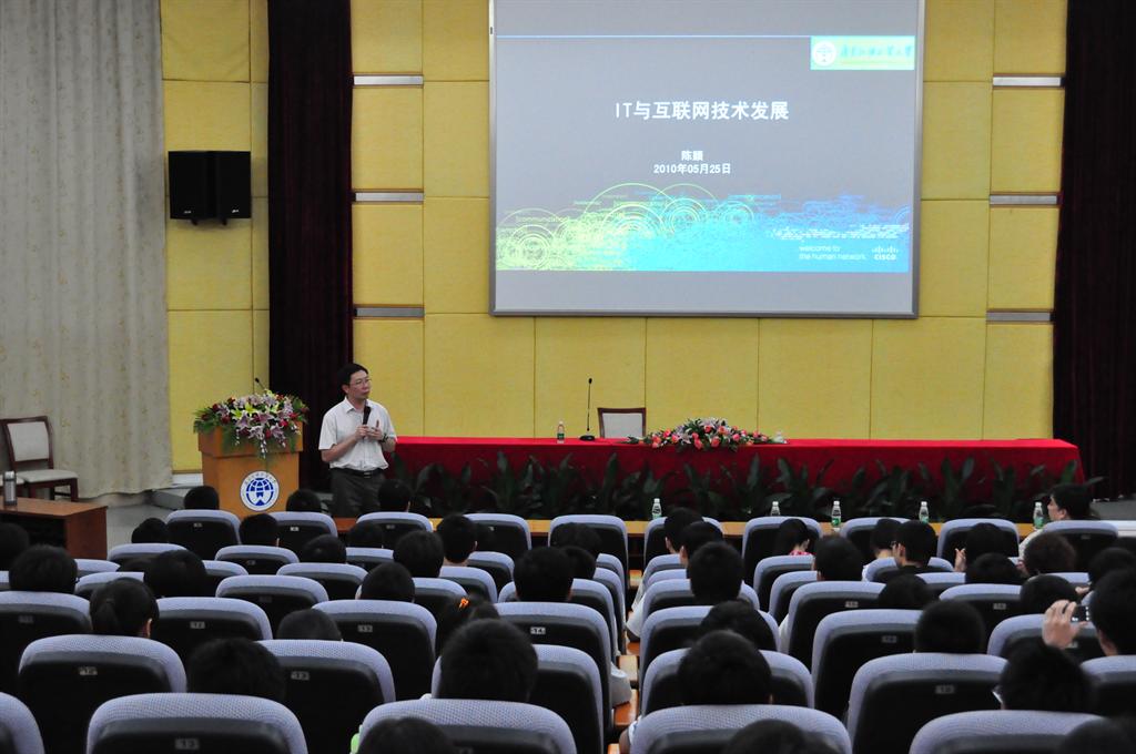 本网讯 2010年5月25日,思科信息学院荣誉院长、思科公司华南区技术总监陈颖,与思科公司华南区教育经理王勇鹏,一起来到广外,与广外思科信息学院学生首次会面,共同探讨IT与互联网的发展。讲座在八角楼举行,出席现场的还有思科信息学院副院长李心广,党委副书记曾智鹏,广外服务外包研究院副院长蒋吉频,团委书记兼07级辅导员汤程荣,08级辅导员叶开。