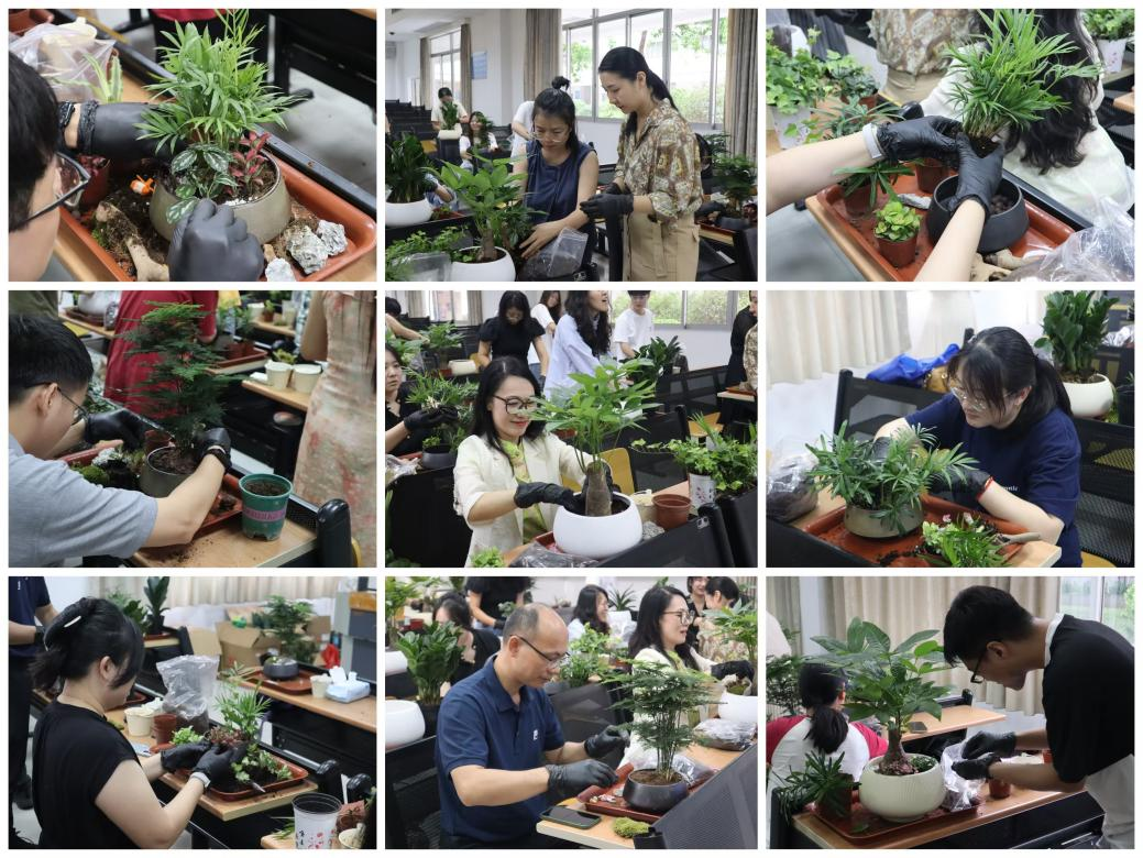 此次活动,学院工会选择了山水植物盆景进行创作,并提前精心准备好盆景的制作材料,在专业老师的耐心指导下,老师们学习了盆景的基本制作步骤和设计思路等。制作过程中,“巧手裁景”的主题被老师们演绎得淋漓尽致,山石与绿植搭配演绎出“远山近水”的意境。