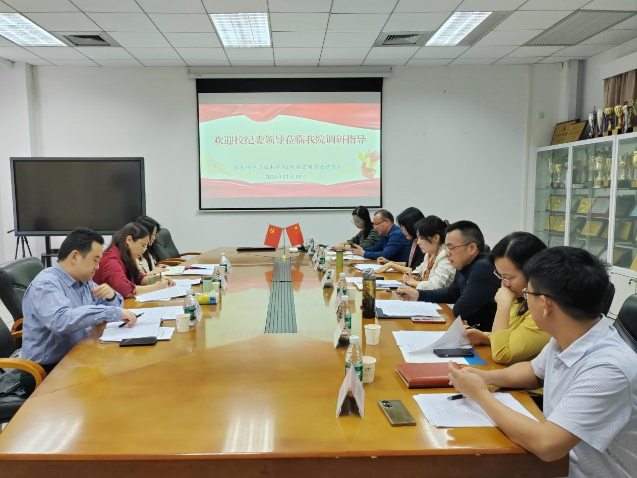 校纪委副书记、纪检监察室主任苏奕,纪检监察室副主任陈闰陪同参加调研。学院党政班子成员、党政办公室主任参加会议。