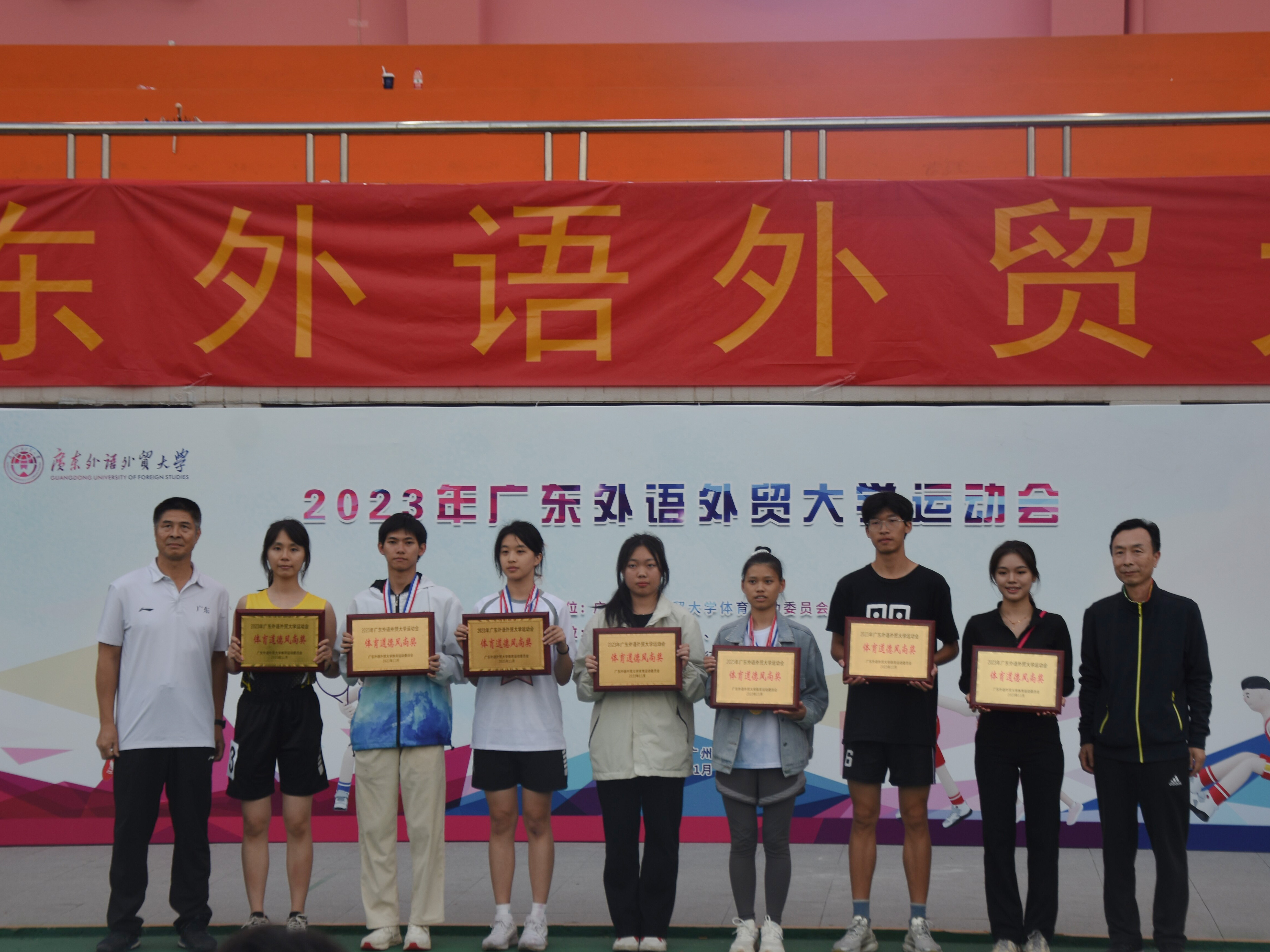 本网讯 我院于2023年11月24日、25日参加2023年广东外语外贸大学运动会。本次校运会各个学院学生与工会老师积极参与,共有超过800名选手报名参赛。信息学院党委副书记刘丽玉老师、团委书记宋鹏飞老师参加了本次校运会开幕式,并观摩了比赛。我院共派出16名运动员参赛,获得多个奖项。最终我院团体总分超过130分获得团体总分第七名和体育道德风尚奖结束本次校运会。