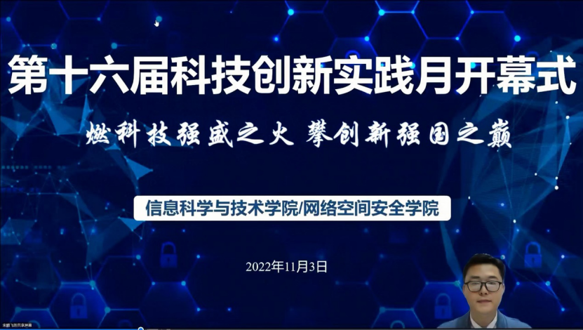 本网讯 2022年11月3日下午,广东外语外贸大学信息科学与技术学院/网络空间安全学院(以下简称“信息学院”)第十六届科技创新实践月(以下简称“科技月”)于线上“云开幕”。今年的科技月以“燃科技强盛之火,攀创新强国之巅”为主题,信息学院院长蒋盛益,党委书记柯晓华,副院长李霞、谢柏林、王常吉,副书记肖锋、各系部主任、学院全体辅导员和两百多名同学参加了开幕式。本次会议由信息学院团委书记宋鹏飞主持。