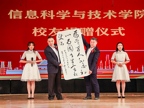 由于当前疫情防控要求,校友们无法现场出席晚会,但优秀校友代表纷纷从全球各地发来短视频。二十年信息人,有无数的故事、无数的点滴、无数的回忆。校友们娓娓道来,代表6786名校友向学院传达思念、感恩与祝福。更有热心校友委托在校优秀学生代表向学院进行捐赠,助力学院发展,此外,曾智鹏向学院赠送亲笔题词“为党育人不忘初心,为国育才牢记使命”。