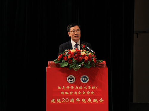 随后,何传添进行致辞,回顾信息学院建院二十年来在内涵式发展道路上取得的卓著成果。他说道,从2001年招生人数116人到如今在校生1545人,信息学院从小到大,取得了磊磊硕果。信息学院获得了教育部特色专业、国家一流本科专业建设点、广东省级特色专业、广东省一流专业建设点。学生获得了“全国小平科技奖”、“全国小平科技创新团队”、“全国三好学生”、国家网络安全奖学金、全国网易奥运官方站网页设计大赛全国第一名、省“强网杯”网络安全大赛冠军、广东省挑战杯特等奖等殊荣。从中国首个"全球白帽黑客奥斯卡"大奖得主到上市公司的老总,从行业顶尖科技公司高管到金融机构、政府部门、研究机构技术骨干,信息学院的优秀校友遍布各行各业。同时,他期待信息学院在以往取得成绩的基础上,叩问初心、牢记使命、承前启后、继往开来、矢志在全力推进大学建设成为国家满意、人民满意、社会满意的国际化特色鲜明的高水平大学的新征程上奋勇前进。
