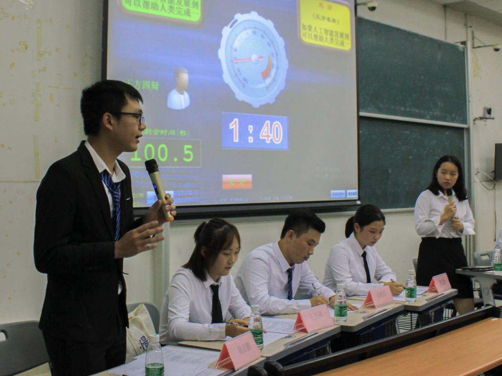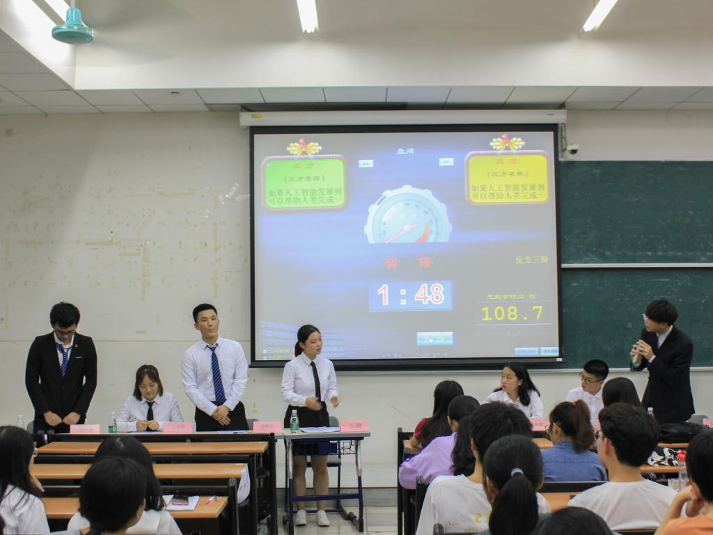 本次辩论赛的题目是“如果人工智能发展到能够帮助人类完成一切工作,这样的生活是可喜的还是可悲的。”正方代表队——信息学院代表队的观点是“如果人工智能发展到能够帮助人类完成一切工作,这样的生活是可喜的。”反方代表队——由多个学院组成的联合学院代表队的观点是“如果人工智能发展到能够帮助人类完成一切工作,这样的生活是可悲的。”